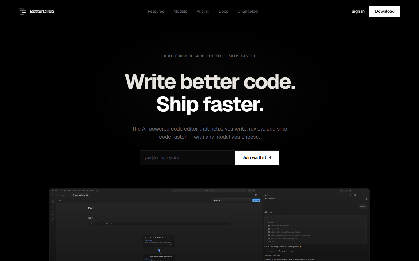 Betterc0de wollte sich als schlanke, privacy-first Alternative zu bestehenden KI-Code-Editoren positionieren. Die Landing Page musste die Multi-Model-Unterstützung und den Local-First-Ansatz klar kommunizieren.