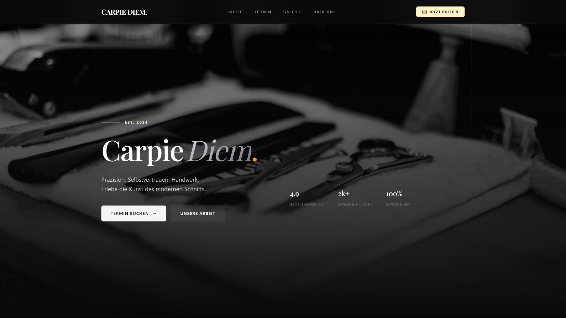 Der Barbershop Carpie Diem wollte sich als Premium-Marke positionieren. Die Website sollte das exklusive Handwerk widerspiegeln und gleichzeitig ein modernes Online-Buchungssystem bieten.