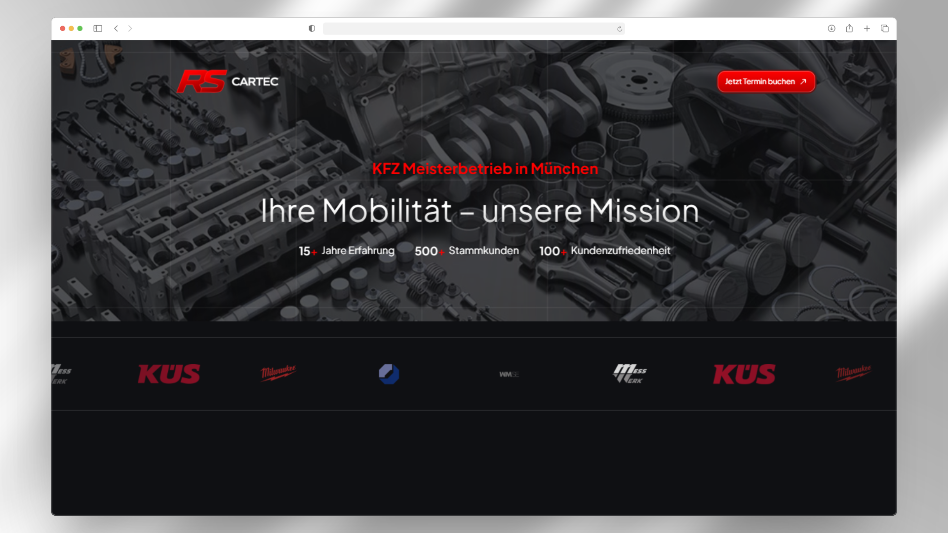 RS Cartec ist eine KFZ-Meisterwerkstatt, die sich auf Reparaturen und professionelles Tuning spezialisiert hat. Die neue Website sollte die technische Expertise und Leidenschaft für Fahrzeuge vermitteln.